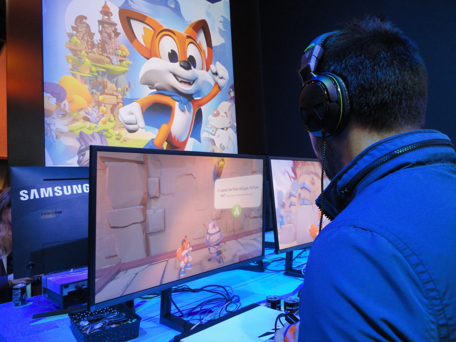 Après une petite pause déjeuner bien méritée, nous sommes partis du côté de chez Microsoft pour essayer un jeu sans grande prétention : Super Lucky’s Tale.